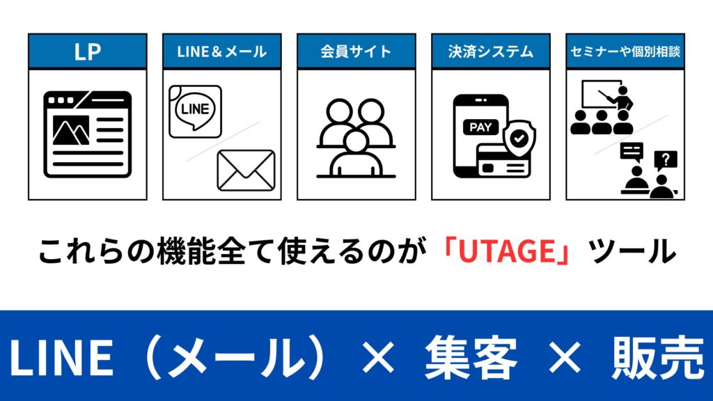 LINE(メール)×集客×販売を全て「UTAGE」のみで出来る 投稿公開日:2025年12月23日 投稿カテゴリー:UTAGE / 補助金コンサル 今では、大手企業から個人事業主まで使われているのは、LINEです。飲食店へ行くと今では多くのお店がLINEのQRコードを置いてあり、友達登録すると割引サービスがあるというお店も増えてきました。従来は、メールアドレスのみでしたが今ではLINEも主戦場になってきたという形ですね。 目次 Toggle 1. UTAGE(ウタゲ)とは?hhh 1. UTAGE(ウタゲ)とは? hhh おすすめ 【2026最新版】最大450万!LINE集客を補助金×UTAGEで「辞めない営業マン」を構築 2025年12月24日